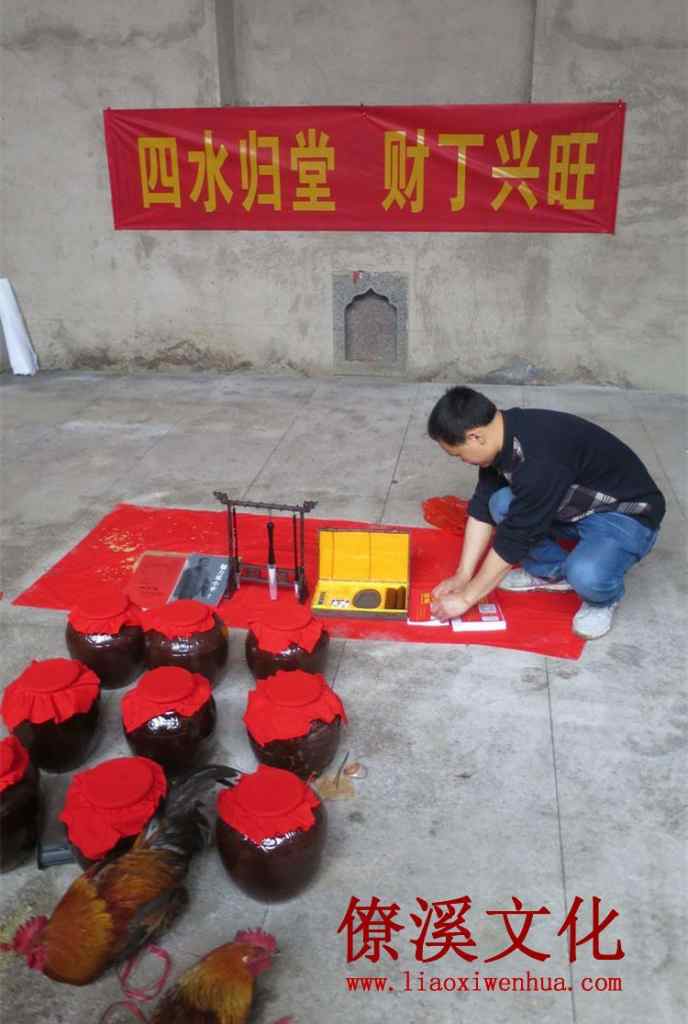 The ceremony of placing the cornucopia and patio in warm water Lin’s ancestral temple was presided over by Mr. Zeng Zhihan, the first village of Chinese feng shui culture in Jiangxi Xingguo Sanliao
